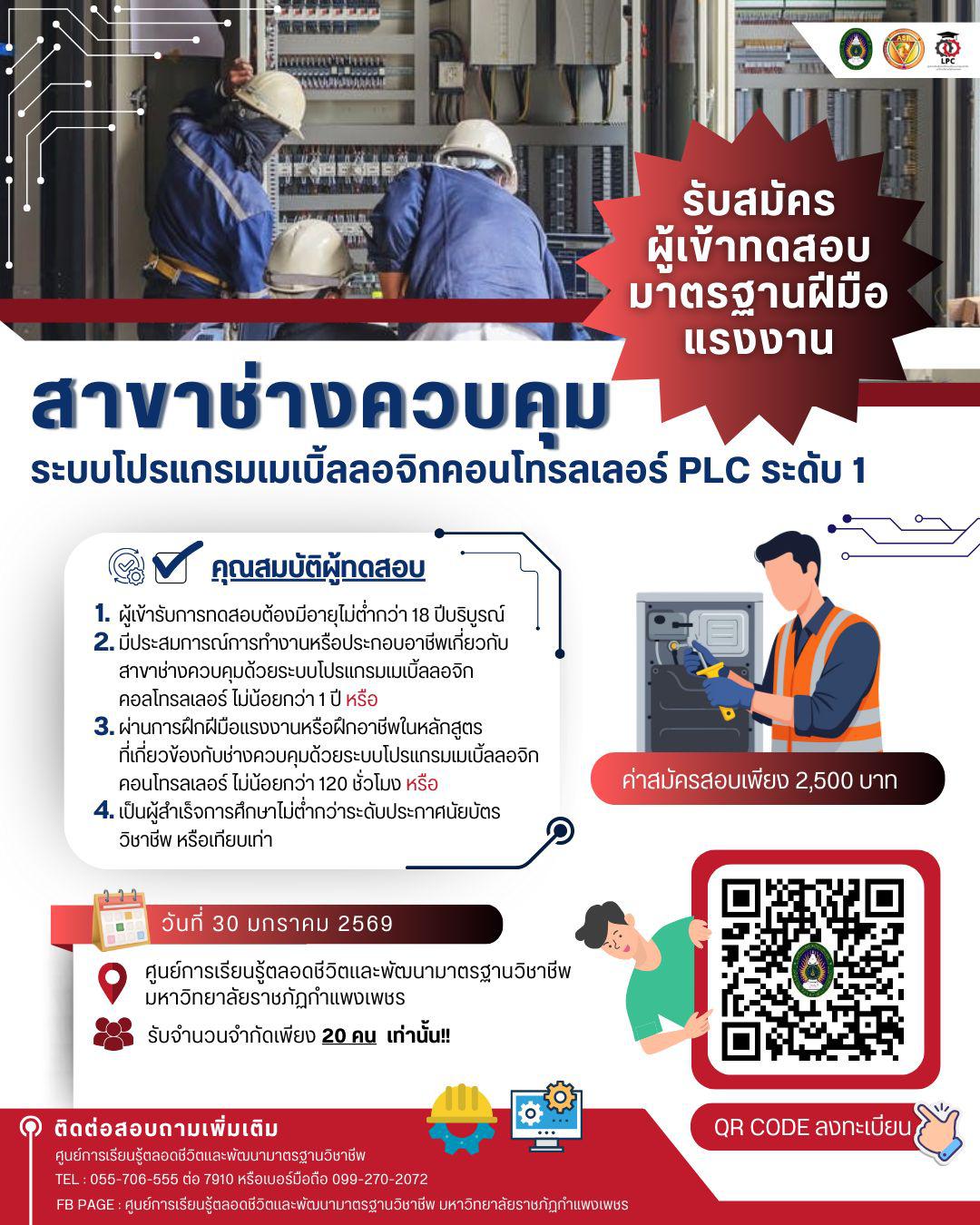 ศูนย์การเรียนรู้ตลอดชีวิตและพัฒนามาตรฐานวิชาชีพ มหาวิทยาลัยราชภัฏกำแพงเพชร. (2569). หลักสูตร ช่างควบคุมด้วยระบบโปรแกรมเมเบิ้ลลอจิกคอนโทรลเลอร์ (PLC) ระดับ ๑. สืบค้น 26 กุมภาพันธ์ 2569, จาก https://asl.kpru.ac.th/lpc/?lang=TH&page_id=72