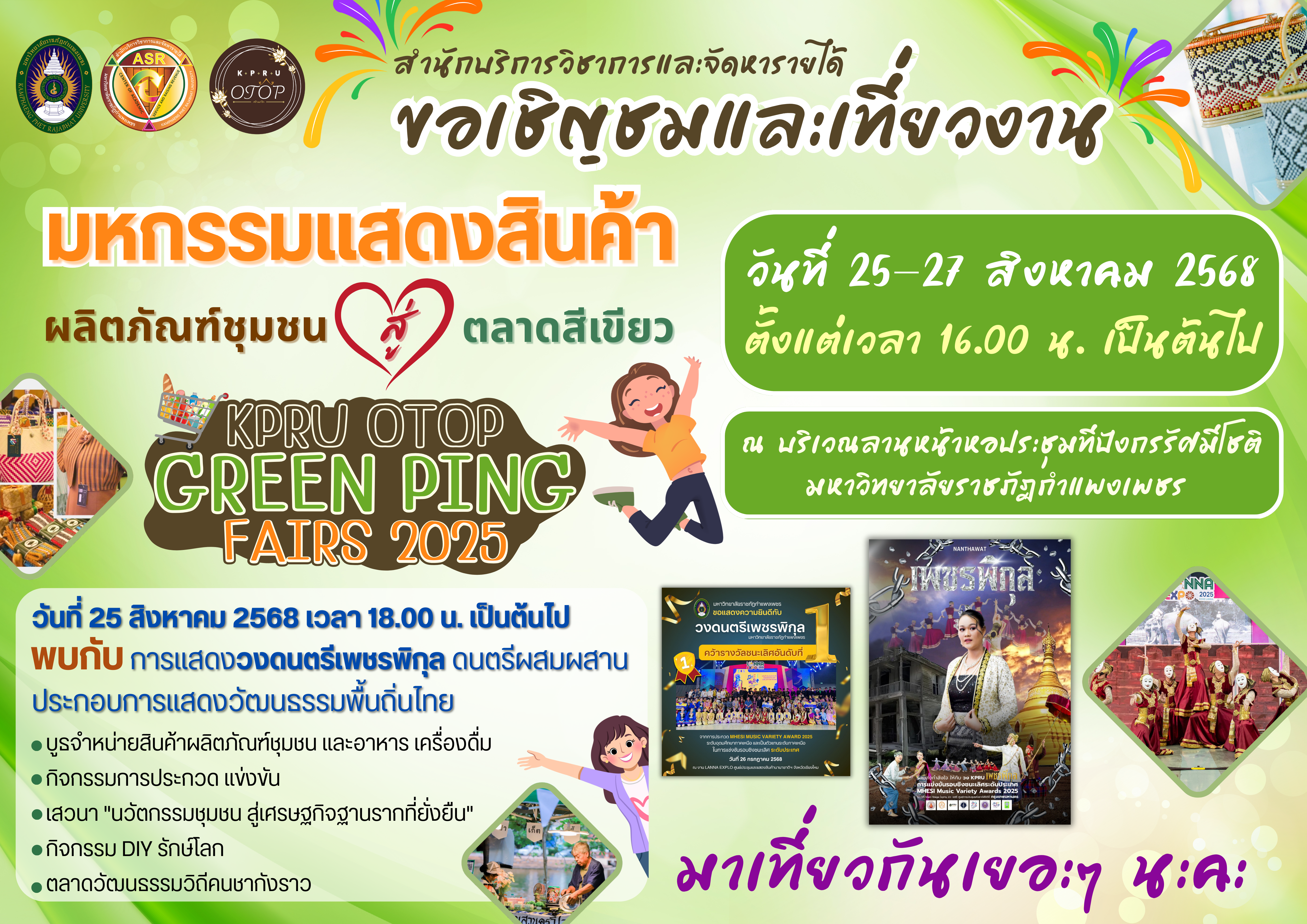 สำนักบริการวิชาการและจัดหารายได้ มหาวิทยาลัยราชภัฏกำแพงเพชร. (2568). ขอเชิญชมและเที่ยวงาน มหกรรมแสดงสินค้า ผลิตภัณฑ์ชุมชน สู่ ตลาดสีเขียว. สืบค้น 30 มกราคม 2569, จาก https://asl.kpru.ac.th/main/?lang=TH&page_id=906