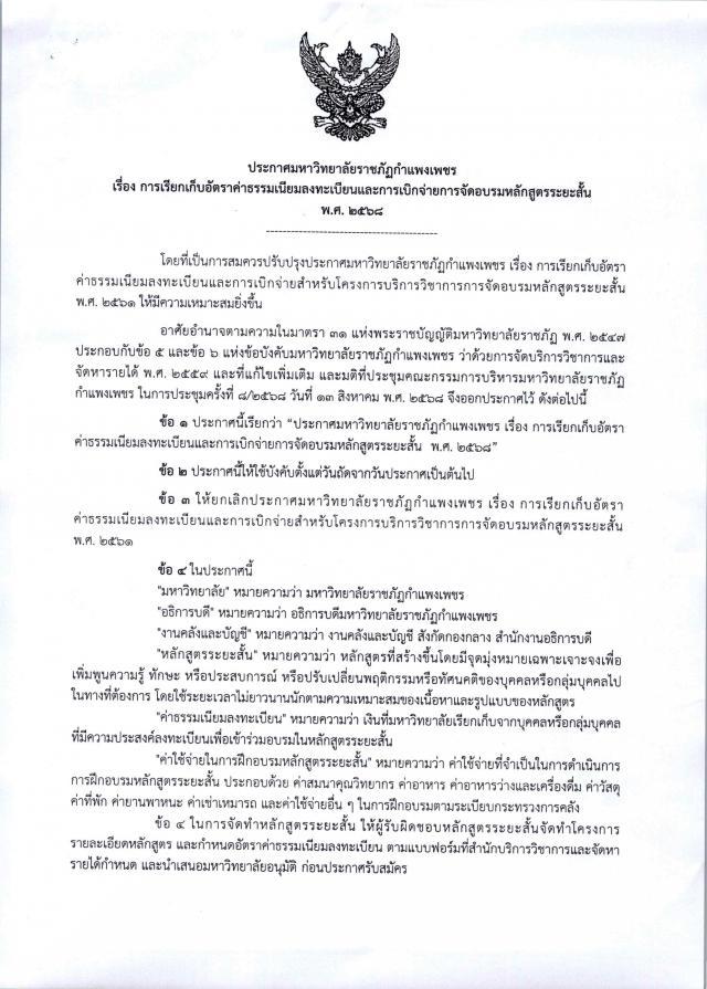 ประกาศ การเรียกเก็บอัตราค่าธรรมเนียมลงทะเบียนและการเบิกจ่ายการอบรมหลักสูตรระยะสั้น พ.ศ.2568