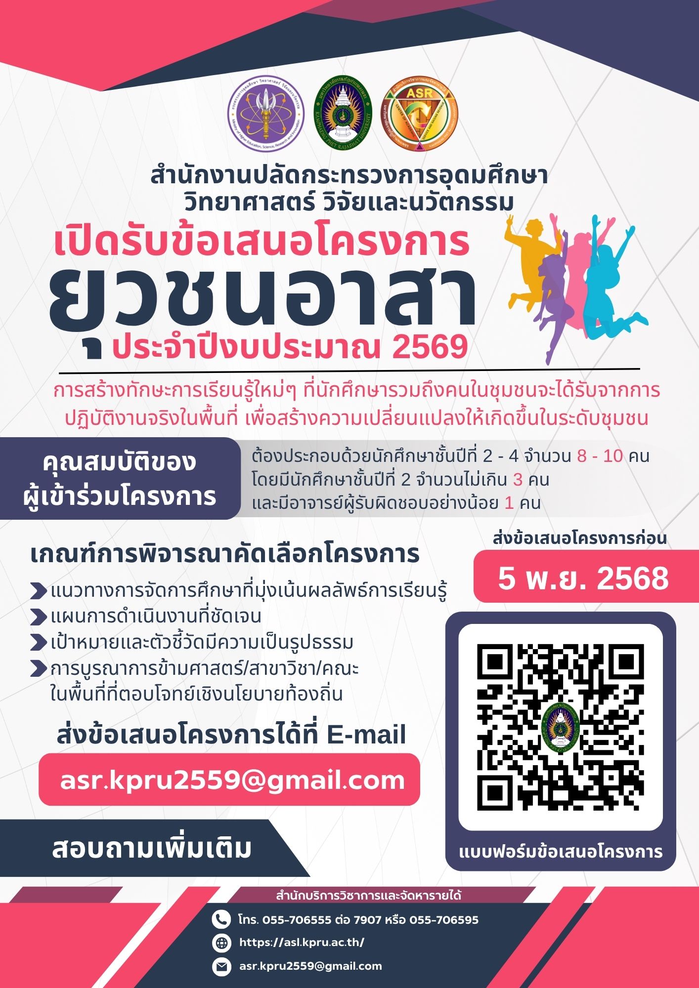 สำนักบริการวิชาการและจัดหารายได้ มหาวิทยาลัยราชภัฏกำแพงเพชร. (2568). เปิดรับข้อเสนอโครงการยุวชนอาสา ประจำปีงบประมาณ 2569. สืบค้น 29 มกราคม 2569, จาก https://asl.kpru.ac.th/main/?lang=TH&page_id=917